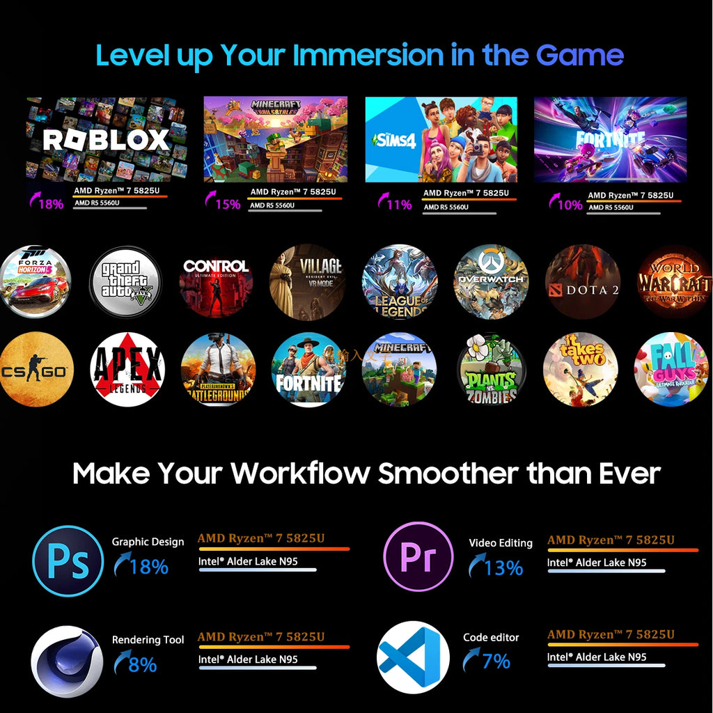 Elite AMD Ryzen 7 5825U Desktop-Level Performance: Unleash the full power of an 8-core, 16-thread beast that can boost up to 4.5 GHz. This Blackview mini gaming PC is engineered to handle demanding AAA titles, professional 4K video editing, 3D rendering, and heavy multitasking with incredible ease. It delivers a high-performance computing experience that rivals bulky desktops, all in a ultra-compact form factor.