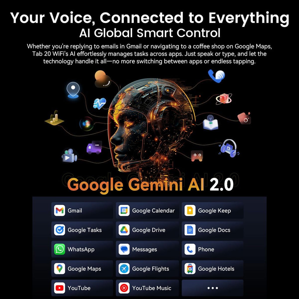 Your Daily Genius, Ready in a Tap: Gemini AI 2.0 with Flash Thinking Experimental, It thinks with depth and acts with speed—just like you, only faster. Backed by Gemini AI 2.0 and Flash Thinking Experimental technology, Blackview Tab 20 WiFi reads context, processes complexities, and responds instantly—before you even realize you need help.(AI Voice Activation, AI Global Smart Control, AI Real-time Conversation, AI Text-to-Image)