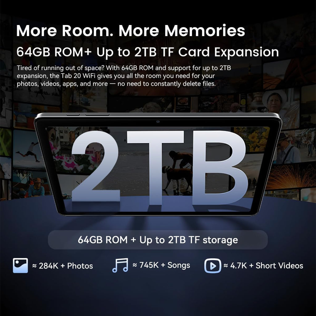 Up to 12GB RAM=4GB RAM + 8GB Expansion, 64GB ROM+ Up to 2TB TF Card Expansion: Forget freezing apps and sluggish transitions. Tab 20 WiFi’s 12GB of total memory gives you the freedom to multitask effortlessly, stream seamlessly, and navigate with confidence.Tired of running out of space? With 64GB ROM and support for up to 2TB expansion, the Tab 20 WiFi gives you all the room you need for your photos, videos, apps, and more.