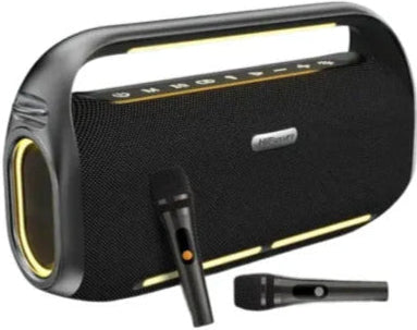 HiFuture MusicBox 300 with 18000 mAh Battery and 2 Microphones, HiFuture MusicBox 300 Wireless Bluetooth Speaker is the perfect device to turn any gathering into a special party with its powerful 150W sound and delightful lighting effects synchronized with the music. It features digital sound processing technology and amenities like two wireless microphones for karaoke sessions, making it an ideal partner for fun and interaction. With a strong 18000 mAh battery capacity and modern wireless connectivity technology, MusicBox 300 ensures an exceptional experience at any occasion, making it the optimal choice for party and event enthusiasts.