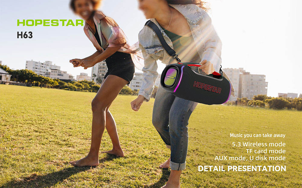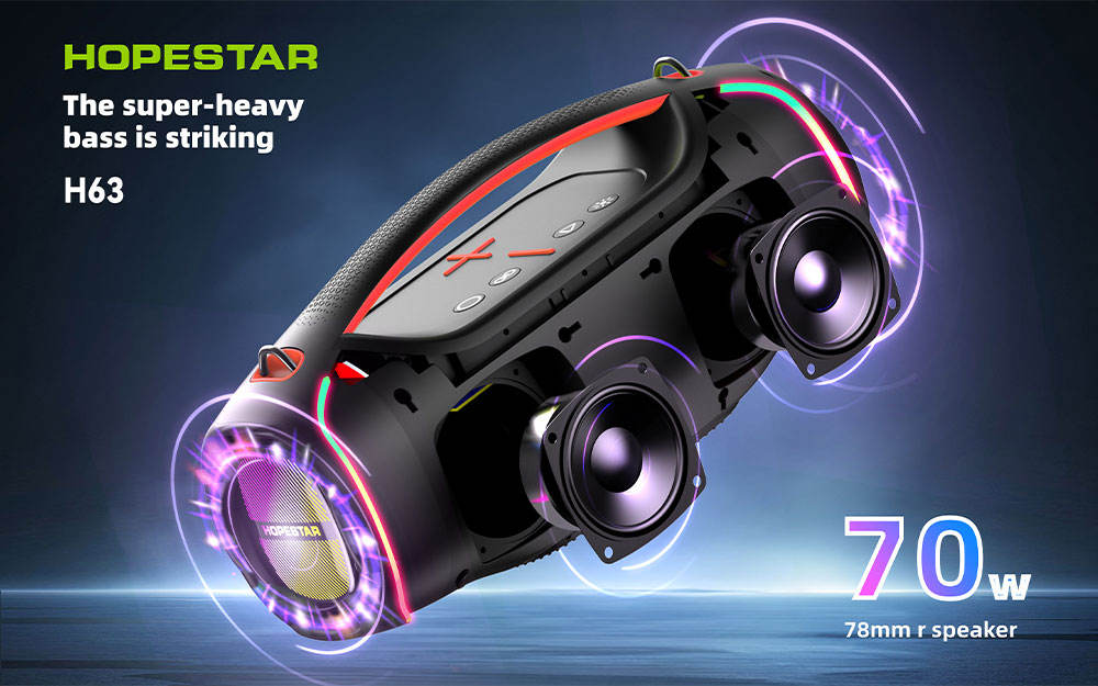 The HOPESTAR H63 Portable Bluetooth Speaker delivers crisp treble and deep bass with dual 20W speakers, making it perfect for outdoor adventures, beach trips, parties, and mobile use in Guyana. With Bluetooth 5.0, the H63 ensures fast and stable wireless connections to smartphones, tablets, and laptops, while TWS (True Wireless Stereo) allows pairing two units for an immersive 360° sound experience.