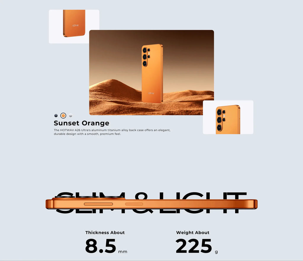 With a premium aluminum titanium alloy back design, slim 8.5mm thickness, and elegant finish, the HOTWAV A26 Ultra delivers both style and durability for everyday use.