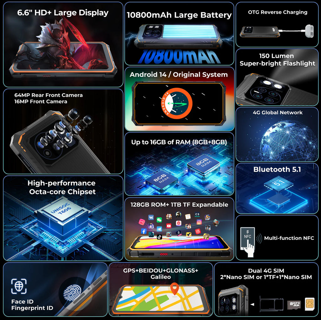 One of the standout features is its massive 10800mAh battery, providing exceptional endurance for long trips, workdays, and outdoor activities. The phone also supports OTG reverse charging, allowing it to power other devices when needed.