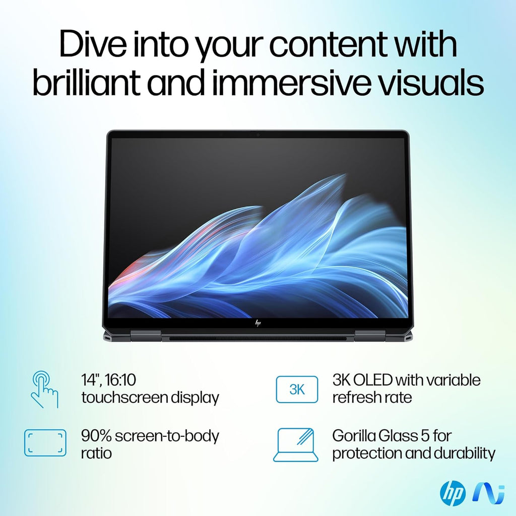 The brilliant 14-inch 2.8K (2880x1800) 120Hz touchscreen display delivers breathtaking clarity with 100% DCI-P3 color accuracy, HDR 500 support, and up to 500 nits brightness. Protected by Corning Gorilla Glass 5, the edge-to-edge micro-bezel design offers a premium viewing experience whether you're working, streaming, or creating.