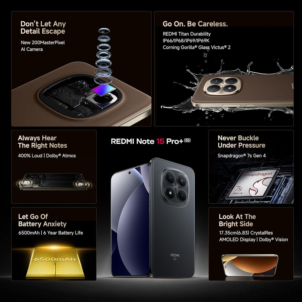 Built with REDMI Titan durability, the Redmi Note 15 Pro Plus features Corning® Gorilla® Glass Victus® 2 and advanced IP66, IP68, IP69, and IP69K protection, making it resistant to dust, water, and accidental drops.