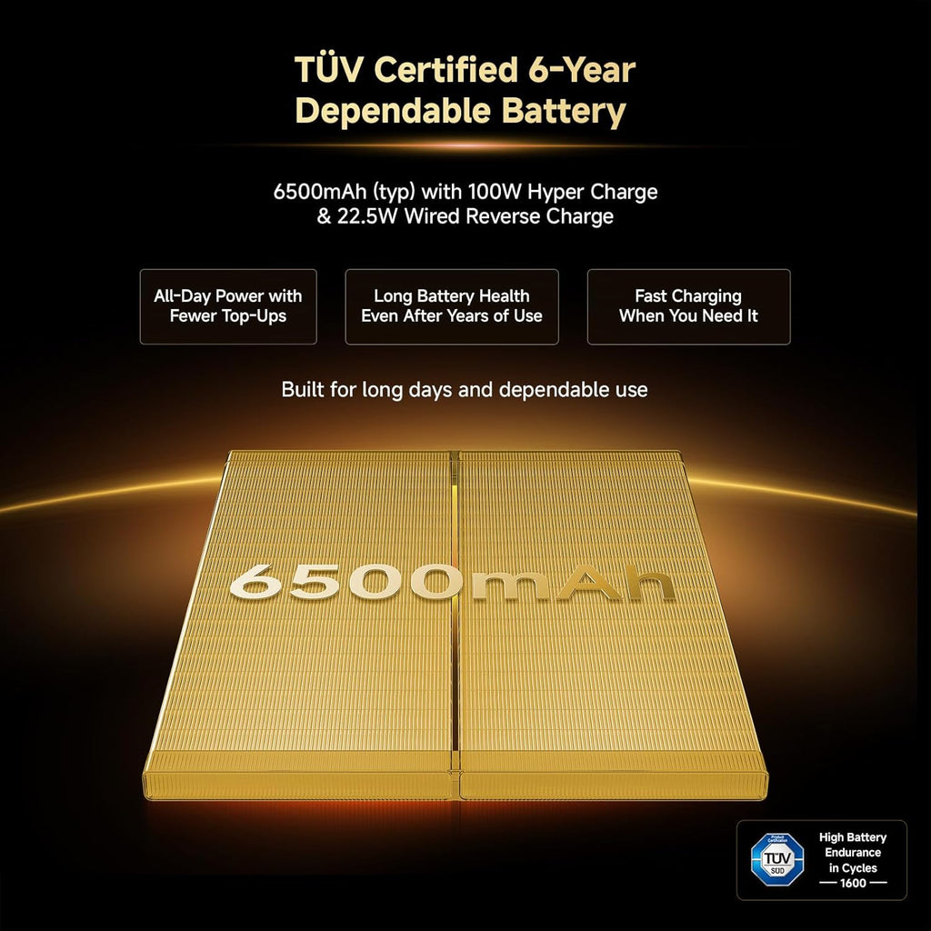 The 6500mAh TÜV-certified long-life battery is designed for extended endurance and up to 6 years of dependable battery health. With 100W HyperCharge technology, the device powers up extremely quickly so you can stay connected throughout the day.