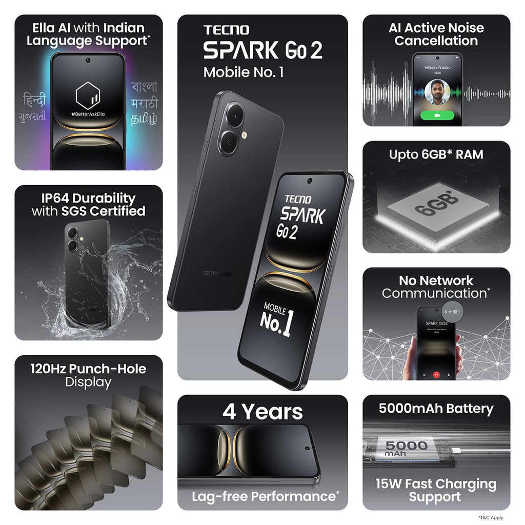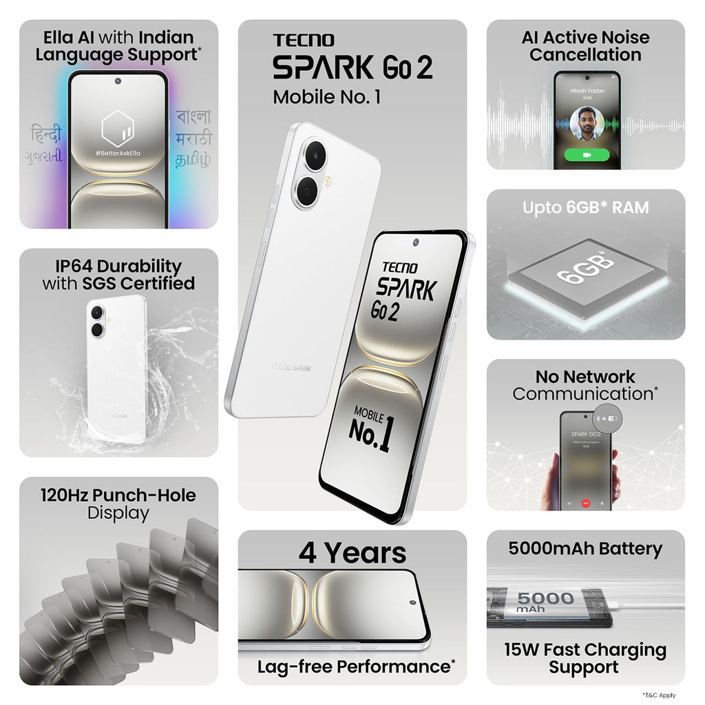 Adding a premium touch, the Spark Go 2 comes in a sleek flat-edge flagship-style design, giving you the look and feel of a high-end smartphone. With Ella, your AI assistant supporting Indian languages, and a design that turns heads, this phone delivers beyond expectations.