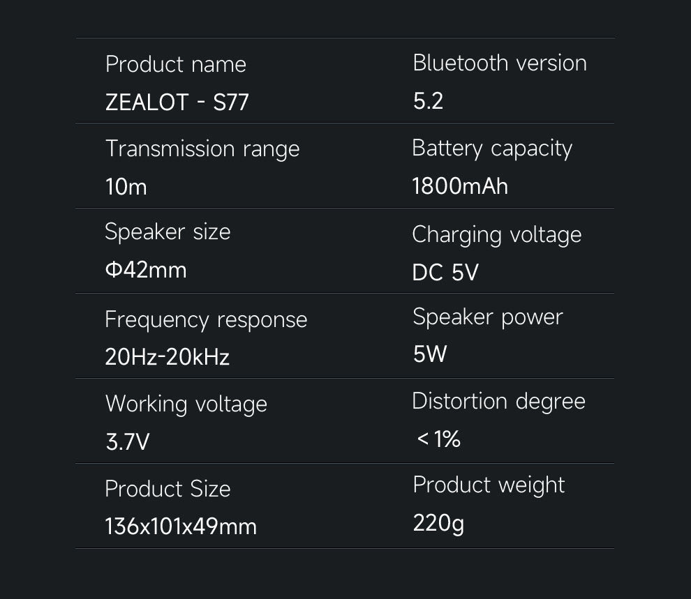 Powered by Bluetooth 5.2, the ZEALOT S77 delivers a stable wireless connection with a transmission range of up to 10 meters. Its 5W full-range speaker driver produces clear sound with deep bass and minimal distortion, ideal for music, calls, and entertainment.